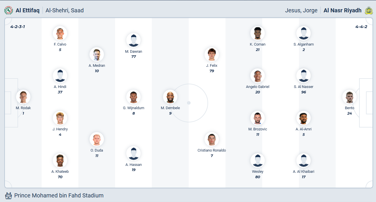 Al Nassr chưa có danh hiệu nào từ khi chiêu mộ siêu sao Cristiano Ronaldo cách đây 3 năm, chính vì vậy họ rất quyết tâm có được một danh hiệu ở mùa giải này. Các cầu thủ Al Nassr đang chơi cực tốt tại giải vô địch Saudi Arabia khi toàn thắng cả 9 trận đã đấu của mình, họ chính là ứng cử viên sáng giá nhất cho chức vô địch. Mùa giải vẫn còn rất dài nên Al Nassr vẫn cần phải cần trọng và đương nhiên cần tiếp tục giành chiến thắng trong các trận đấu của mình. Vậy nên khi đến làm khách trên sân của Al Ettifaq thì 3 điểm là điều mà Al Nassr hướng đến, với đội hình có phong độ cao và chất lượng tốt hơn đối thủ khá nhiều thì sẽ không có gì ngạc nhiên nếu đội khách có được chiến thắng.