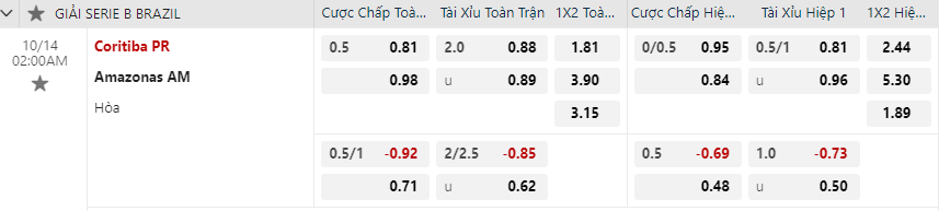 Tỷ lệ kèo Coritiba vs Amazonas