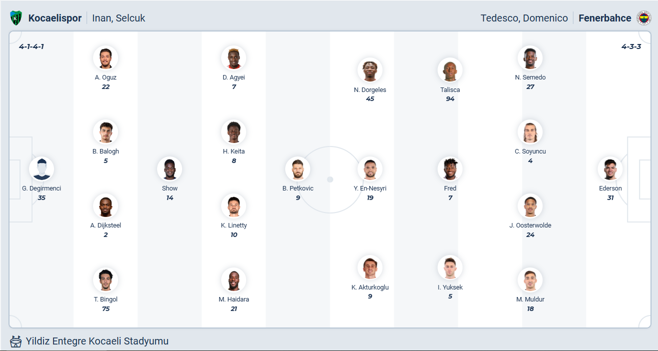 Fenerbahce vẫn luôn là 1 trong vài đội mạnh của giải Thổ Nhĩ Kỳ, tuy nhiên chức vô địch quốc gia gần nhất của họ đã từ năm 2014 và trong vài mùa bóng gần đây đội bóng của HLV Domenico Tedesco luôn bị Galatasaray bỏ xa trong cuộc đua vô địch. Mùa này các cầu thủ Fenerbahce đã làm tốt hơn, dù vẫn đứng thứ 2 nhưng họ chỉ kém đội đầu bảng 3 điểm, họ bất bại tại Super Lig từ đầu mùa và hoàn toàn có thể đua vô địch với Galatsaray. Muốn thực hiện điều đó thì Fenerbahce cần một chiến thắng khi đến làm khách trên sân của Kocaelispor, với đội hình mạnh hơn hẳn thì nhiều khả năng điều đó sẽ đến.