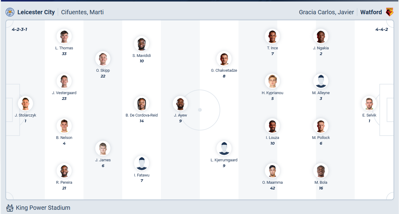 Leicester là đội phải xuống hạng từ Premier League mùa trước, họ đương nhiên muốn cạnh tranh cho chiếc vé thăng hạng ở mùa giải này nhưng mọi thứ đang diễn ra rất tệ. Các cầu thủ Leicester chỉ đang đứng thứ 13 trên bảng xếp hạng và ngày càng xa một vị trí trong top 6. Cơ hội chưa hẳn đã hết bởi khoảng cách với các đội xếp trên không lớn, điều Leicester cần làm là chơi tốt hơn trong nửa sau của mùa giải. Sau khi để thua ở vòng đấu trước thì họ cần một chiến thắng ở vòng đấu sắp tới. Tuy nhiên trước một Watford chơi ổn định thì khả năng Leicester sẽ chỉ có được kết quả hòa.
