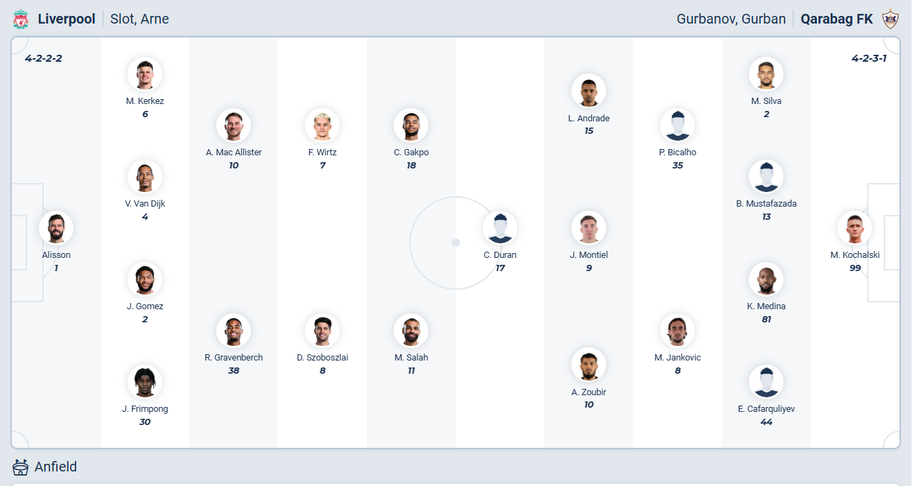 Liverpool thắng 5, thua 2 sau 7 lượt đấu, họ đang đứng thứ tư trên bảng xếp hạng, vị trí tương đối ổn. Tuy nhiên đội bóng của HLV Arne Slot đang gặp rất nhiều sức ép vì chuỗi trận đáng thất vọng ở đấu trường quốc nội, họ đã không còn khả năng cạnh tranh ngôi vô địch. Chính vì vậy Liverpool sẽ dồn sức vào Champions League, nơi họ đang chơi khá tốt. Một chiến thắng nữa sẽ giúp đội bóng nước Anh chắc chắn nằm trong top 8 đội mạnh nhất và trước đối thủ yếu như Qarabaq thì nhiều khả năng đội bóng chủ nhà sẽ không gặp nhiều khó khăn để có được điều mình cần.