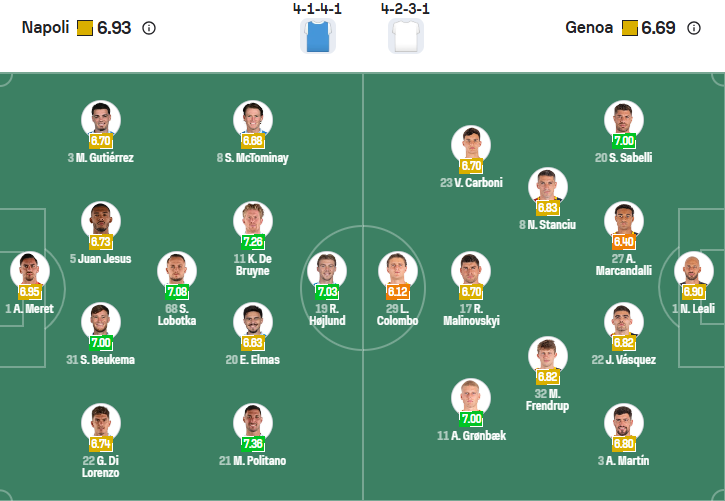 Genoa không phải đội mạnh của Serie A, họ đứng thứ 13 mùa giải trước, vị trí chấp nhận được. Mùa giải năm nay đội bóng của HLV Patrick Vieira muốn làm tốt hơn nhưng mọi thứ đang không như họ dự định, các cầu thủ Genoa chưa thắng trận nào, mới có 2 điểm và đang đứng thứ 19 trên bảng xếp hạng. Nếu không chơi tốt hơn thì nguy cơ xuống hạng với Genoa là rất rõ ràng nên họ cần một kết quả tốt ở vòng đấu thứ 6 này. Tuy nhiên họ phải đến làm khách trên sân của đương kim vô địch Napoli nên cơ hội có điểm rất mong manh, nhiều khả năng Genoa sẽ phải nhận thêm một trận thua nữa.