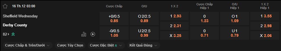 Soi kèo hiệp 1 Sheffield Wed vs Derby County: 0.92*1.0*0.93