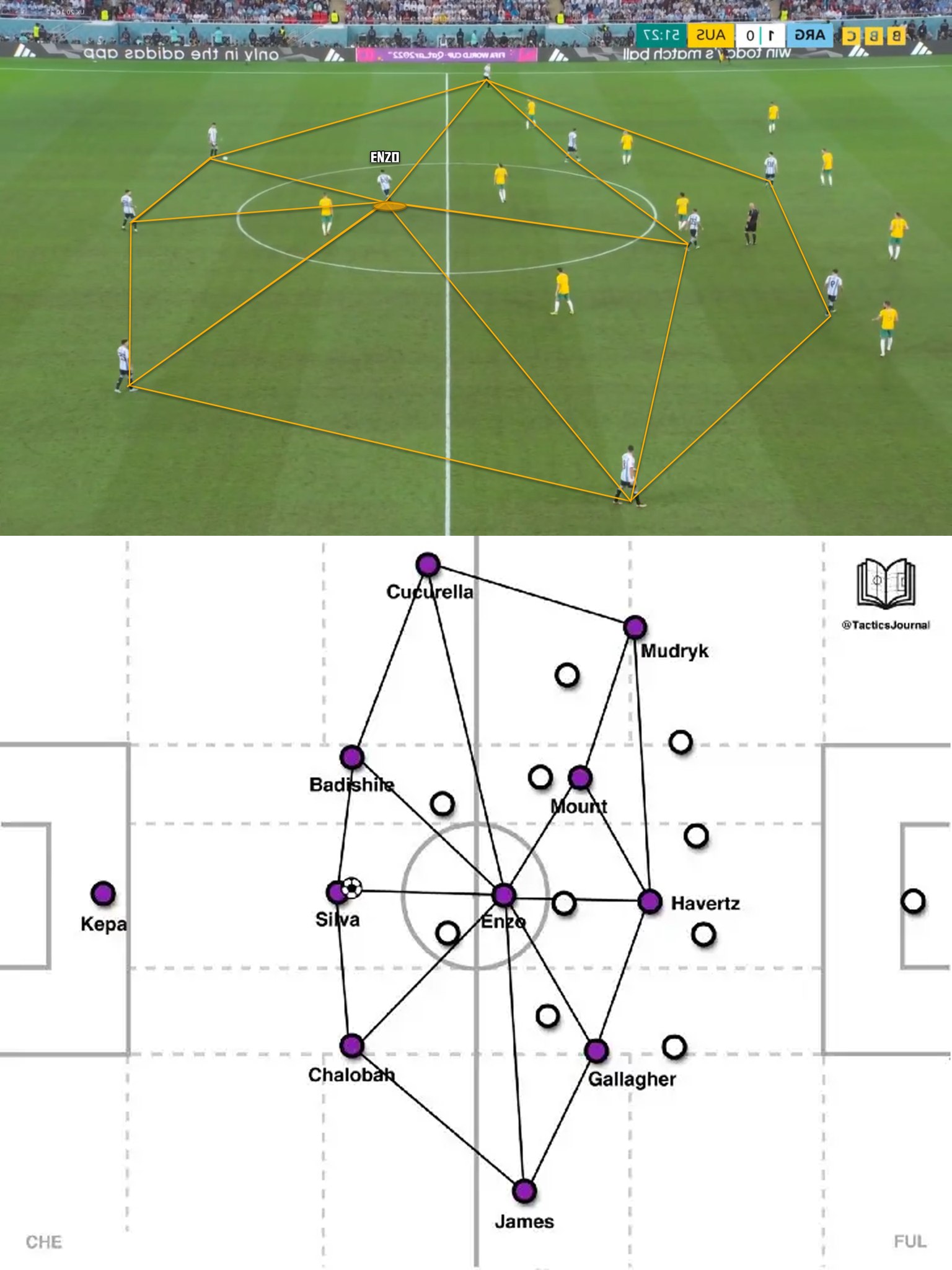Cách bố trí trên giúp Enzo trở thành trung tâm của lối chơi, nhận bóng, xử lý và kết nối tuyến dưới và hàng tấn công bằng các đường chuyền ngắn và trung bình.